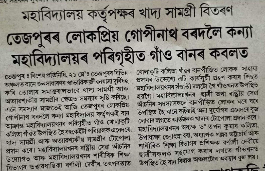 | 48 | Flood Relief Drive | On 20.05.2022, N.S.S unit flood relief drive in the adopted village, Khulakuti, Kacharigaon, Dipota. | 2022-05-20 | View File |